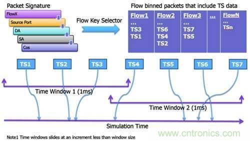 某些情況下,可能需要數百萬個資料包才能切中當前設計中穩態分析的重點。以測量兆百萬位元組乙太網交換機的流量位元速率為例。采用虛擬乙太網簽名生成和封包時間戳記(TS)來計算這些數據。