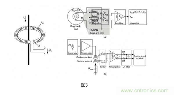 羅氏線圈(圖3)類似于電流互感器,會在次級線圈內會感應產生一個電壓,電壓大小與流經隔離電感器的電流程正比。特殊之處在于,羅氏線圈采用的是氣芯設計,這一點與依賴層壓鋼等高磁導率鐵芯和次級繞組磁耦合的電流互感器完全不同。氣芯設計的電感較小,有更快的信號響應和非常線性的信號電壓。由于采用了這種設計,羅氏線圈經常被用在像手持電表這樣的已有接線上,臨時性地測量電流,可以認為是電流互感器的低成本替代方案。