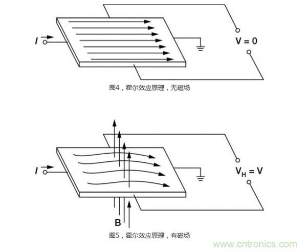 當一個帶電流的導體被放進磁場里時(圖4),在垂直于磁場和電流流動方向上會產生電位差。這個電位與電流大小成正比。在沒有磁場和電流流過時,就沒有電位差。但如圖5所示,當有磁場和電流流過時,電荷與磁場相互作用,引起電流分布發生變化,這樣就產生了霍爾電壓。