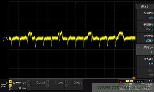 從圖5中可以看出,正確的紋波測量方式可以清晰的捕抓到正常的紋波,減少了不必要的噪聲和雜波對紋波的影響,基本上就是一條干凈的紋波了,在這樣的基礎上進行電源紋波測量,可以更精確的測量紋波的值,進而準確估測電源質量。