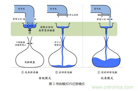 圖 1形象的詮釋了傳統模式和記錄模式的區別;當信號流很大時,直接存到細口瓶肯定溢出,只能先存到寬口瓶,存滿后先停下來,再慢慢傳回細口瓶;當信號流不大時,寬口瓶充當傳輸管,將信號流直接引入細口瓶,可長時間不間斷存儲。