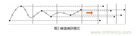 接下來就是峰值捕獲模式,看著名字就知道是什么意思了,就是采集一個采樣間隔信號中的最大值和最小值。