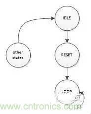 CPLD其內(nèi)部沒有RAM,這樣就不能依靠RAM的初始化數(shù)據(jù)來產(chǎn)生可靠的復(fù)位;從原理上說,器件上電后,其寄存器的狀態(tài)是不確定的,因此我們是沒法得到一個確定的初始狀態(tài)去產(chǎn)生一個可靠的內(nèi)部復(fù)位信號,不過我們還是可以產(chǎn)生一個有一定失敗概率但概率可控的復(fù)位信號,其基本原理是:設(shè)計一個n位的狀態(tài)機,見下圖,其中一種狀態(tài)表示復(fù)位結(jié)束(記為LOOP),只要進入該狀態(tài)就會一直保持在LOOP狀態(tài)上,至于其他狀態(tài)都會跳入復(fù)位狀態(tài)(記為RESET),RESET狀態(tài)是暫態(tài),一個時鐘周期就離開進入LOOP狀態(tài);由于狀態(tài)LOOP出現(xiàn)的概率僅為:1/2n,我們控制n的長度,就可以將復(fù)位失敗概率控制在設(shè)定的要求內(nèi)。