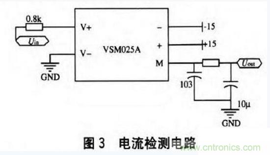 系統(tǒng)所要檢測(cè)的信號(hào)采用霍爾傳感器法檢測(cè),如被測(cè)電源設(shè)備向該簡(jiǎn)易直流電子負(fù)載輸入的電壓,以及流進(jìn)負(fù)載的電流。電壓和電流檢測(cè)分別通過(guò)電壓霍爾、電流霍爾傳感器檢測(cè),并經(jīng)過(guò)必要的輸出轉(zhuǎn)換電路后轉(zhuǎn)換為檢測(cè)信號(hào)。為了提高系統(tǒng)的抗干擾性,檢測(cè)信號(hào)經(jīng)過(guò)一個(gè)低通濾波器濾除噪聲,再送入單片機(jī)的AD轉(zhuǎn)換器中。其中電流霍爾的原理圖如3所示。