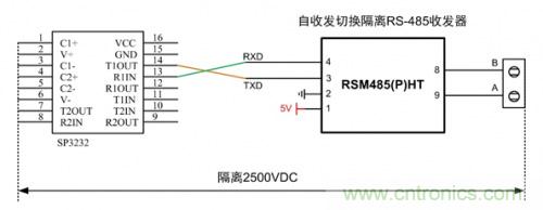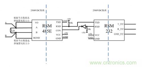 方案一是使用普通的TTL轉232電平IC做232到TTL的電平轉換,隔離電壓2500VDC,方案二是232端和485端均采用隔離模塊,485到232端的隔離電壓可高達5000VDC。