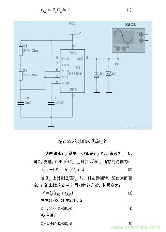 由555芯片構成的多諧振蕩電路如圖2,CX為被測電容,接通電源后,CX被充電,A點電壓UA上升。當UA上升到時,觸發器被復位,同時555芯片內部放電三極管導通,此時U0為低電平。CX通過R2和放電三極管放電,使UA下降。當UA下降到時,觸發器又被置位,U0翻轉為高電平。CX放電所需的時間為: