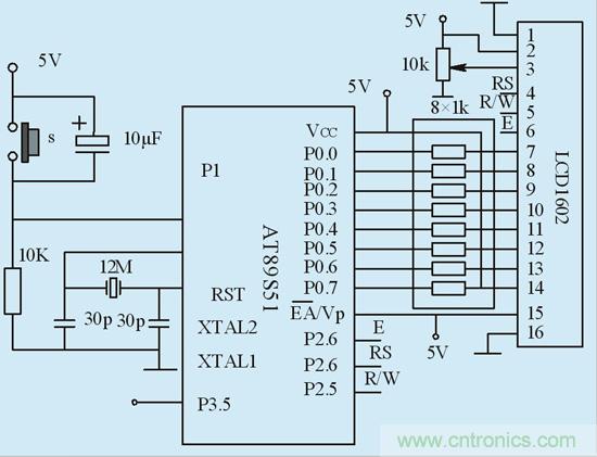 顯示模塊LCD1602液晶第1、2腳接驅動電源;第三腳VL為液晶的對比度調節,通過在VCC和GND之間接一個10K多圈可調電阻,中間抽頭接VL,可實現液晶對比度的調節;液晶的控制線RS、R/W、E分別接單片機的P2.5、P2.6、P2.7;D0~D7為LCD1602液晶模塊的8位雙向數據口,分別與STC89C52RC單片機的P1.0~P1.7相連,用于傳輸數據。接在單片機的P0口;BL+、BL-為液晶背光電源。