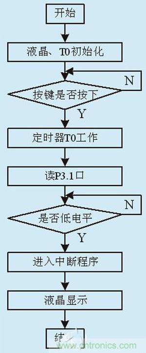 系統軟件環境以Keil4.0為仿真平臺,使用C語言編程編寫了運行程序;包括主程序模塊、顯示模塊和電容測試模塊。軟件設計主要包括三個方面:一是初始化系統;二是按鍵檢測;三是數據采集、數據處理并進行顯示。程序采用模塊化的結構,這樣便于調試和修改,易編程和易讀性好,也程序結構清楚。系統程序流程如圖6所示,首先對P3.5口脈沖信號頻率的測量,再通過(5)式算出所測的電容值,由LCD1602顯示出來。