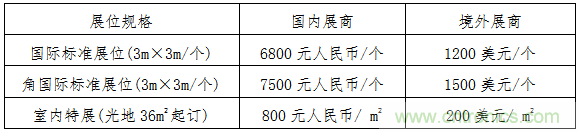 注:A、標準展位提供:三面圍板、楣板制作、洽談桌一張、折椅兩把、射燈兩只、10A/220V插座一個。B、室內特裝展區只提供光地,不提供任何配置,展商自行負責展位搭建布置的各種費用。