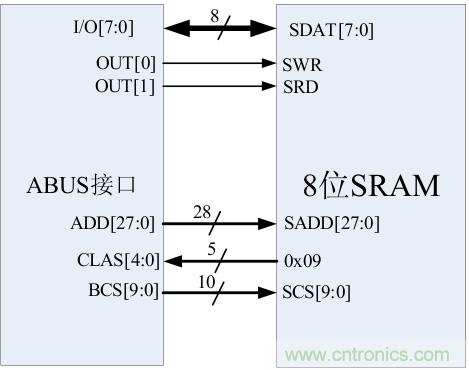 8位SRM模塊與NIOSII通過ABUS(FPGA)連接,實現正確的時序讀寫操作。如圖2-5。表5是信號連接說明。
