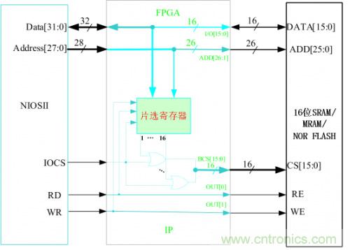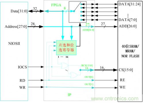 如圖4-3,SRAM、MRAM和NOR FLASH的接口操作基本一致,NIOSII的總線時序完全滿足。故在FPGA內部只要簡單的把相應的控制線和數據線相連就可以了,唯獨只要設計一個片選寄存器,用來區分SIP的16個片選。每一個片選可以訪問的空間為128MByte。片選寄存器的地址為(基址+0x0FFFFFFC),基地睛設在NIOSII 外部總線的最高地址位。