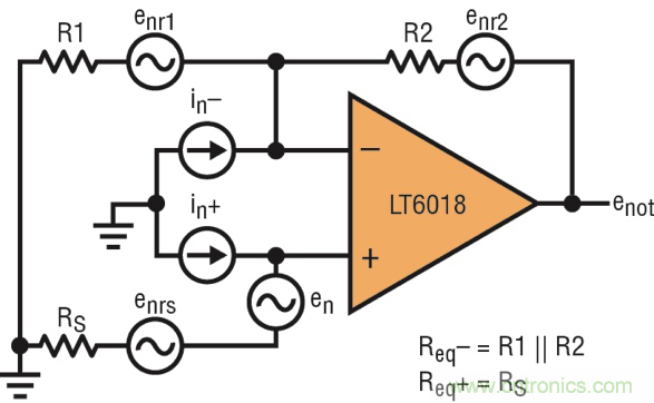 首先,把電阻器看作是噪聲源。電阻器天生具有與電阻值的平方根成比例的噪聲。在 300K 的溫度下,任何電阻器的電壓噪聲密度為 en = 0.13√R nV/√Hz。該噪聲也可被視為一種諾頓 (Norton) 等效電流噪聲:in = en/R = 0.13/√R nA/√Hz。因此,電阻器具有一個 17 zeptoWatts 的噪聲功率。優良的運放將具有低于該值的噪聲功率。例如:LT6018 的噪聲功率 (在 1kHz 頻率下測量) 約為 1 zeptoWatt。
