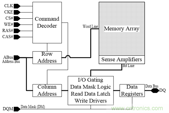 圖1顯示SDRAM的簡要功能方塊圖,行地址選通信號(CAS#)是根據(jù)預(yù)充電而設(shè)計的延遲控制信號,亦即無預(yù)充電則不必分時控制列地址選通信號(RAS#)、CAS#。差動頻率信號(CLK, CKE)的頻率是基于微處理器的工作頻率,數(shù)據(jù)屏蔽信號(DQM)對應(yīng)差動頻率信號的邊緣;這些信號用于進(jìn)行同步傳輸操作。對于感測放大器以及寫入驅(qū)動器的配置規(guī)劃,通常根據(jù)外部數(shù)據(jù)總線的位寬度而設(shè)計相同的數(shù)量,然而,可以導(dǎo)入并行存取的方法來增加存取效率,因此增加了行地址的位寬度以選擇同列不同行的感測放大器與寫入驅(qū)動器。這種方法產(chǎn)生了叢發(fā)模式(burst mode)以及同列存取,但并不會增加訪問速度,并且還要進(jìn)行同步傳輸操作,所以需要數(shù)據(jù)緩存器。