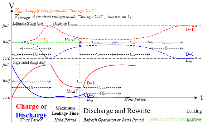 如果說3T DRAM是第一代DRAM技術(shù),使用差動放大器實現(xiàn)讀取功能的1T DRAM是第二代DRAM,那么在本文中的第三代DRAM技術(shù)是指取代差動放大器且大幅提升讀取功能的存取技術(shù)。1T DRAM的內(nèi)存基本單位是由一晶體管和一電容器所組成的儲存單元,又稱為1T DRAM單元。圖3顯示在單一儲存單元上進(jìn)行存取操作的波形,上半部分是使用差動放大器的第二代技術(shù),下半部分是第三代技術(shù),此圖主要用于比較這二者完成讀取操作所需花費(fèi)的最長時間。當(dāng)這一電容器的儲存電壓(Vstorage)放電達(dá)到最小差異電壓(Min. ?V)時就必須立即進(jìn)行更新操作(即讀取),所以此圖呈現(xiàn)有關(guān)讀取操作的最長時間就等于是更新操作的最長時間。圖中標(biāo)示有tprecharge、tread、trewrite、twrite,這些技術(shù)用語依序?qū)?yīng)產(chǎn)品規(guī)格的tRP、tRCD、CL與CWL。第三代技術(shù)無需tRP,除此之外,tRCD也很短暫且可由CWL替換CL,因此訪問速度接近SRAM,存取效率低于SRAM。