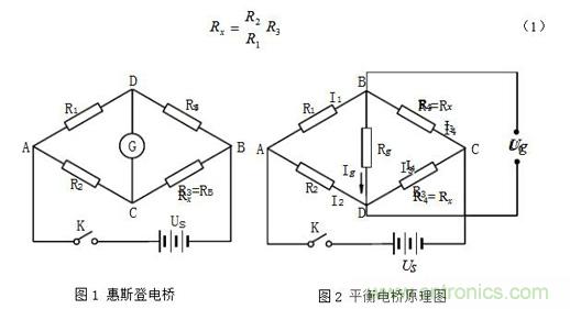 惠斯登電橋(平衡電橋)的原理如圖1所示,調(diào)節(jié)R3使檢流計G無電流流過時,C、D兩點等電位,電橋平衡,從而得到