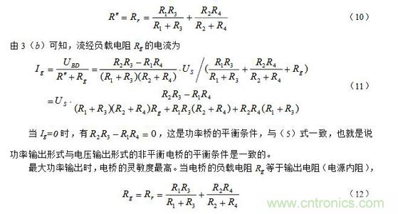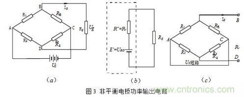 (3)Rg相對橋臂電阻可比擬時的非平衡電橋(功率輸出形式)當(dāng)負載電阻Rg與橋臂電阻可比擬時,則電橋不僅有輸出電壓Ug,也有輸出電流Ig,也就是說有輸出功率,此種電橋也稱為功率橋。功率橋可以表示為圖3(a)。