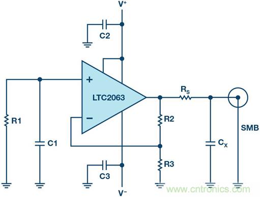 輸出端看到的是10 kΩ RS和一個50 nF接地電容CX。此電容CX將與 LTC2063電路相互作用,導致頻率響應出現峰化。此峰化可用來擴展發生器的平坦帶寬,就像擴音器中的孔眼擴大下端一樣。假設使用高阻抗負載(>100 kΩ),因為低阻抗負載會顯著降低輸出電平,并且還可能影響峰化。