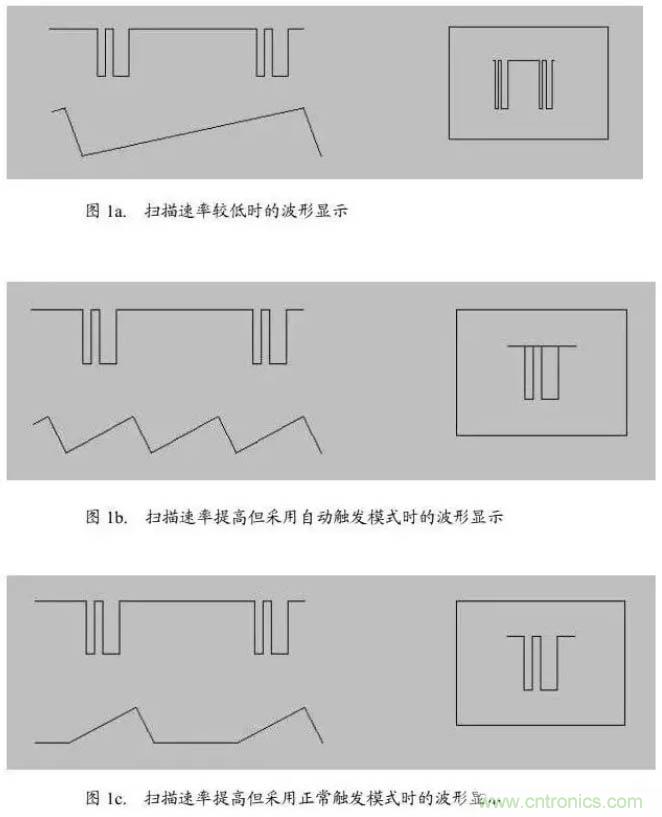 圖1 是這種情況的圖解,在圖1 中,左側上方是被觀測的波形,下方是掃描波形,右側是波形的顯示。圖1a中掃描速率較低,不便于觀察波形的細節;圖1b將掃描速率提高,采用自動觸發模式,這時顯示的波形是不清晰的,有混疊現象;圖1c中的掃描速率與圖1b相同,但采用正常觸發方式,僅在有觸發時才進行掃描,因而顯示清晰的波形。