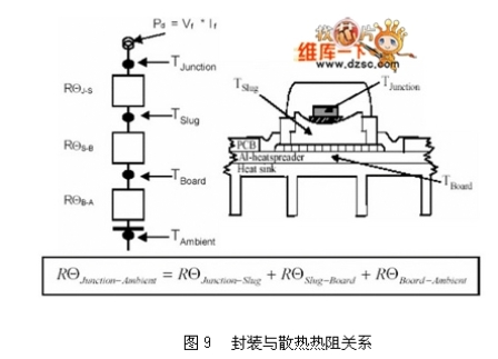 散熱設(shè)計(jì)是LED光源區(qū)別于傳統(tǒng)光源的課題之一。傳統(tǒng)燈具產(chǎn)生的熱遠(yuǎn)高于LED,但傳統(tǒng)燈具不會(huì)因?yàn)楦邷囟档推涔庠摧敵瞿芰Γ蹋牛牡墓廨敵鰠s會(huì)隨著本身接口(Junction, PN接口)溫度的升高而下降,如圖8所示。而其產(chǎn)生的熱如何散除到外界環(huán)境與其封裝結(jié)構(gòu)材料息息相關(guān),牽涉到使用的散熱材料與相關(guān)外型,關(guān)系如圖9所示,其中熱阻的概念,代表輸入W功率時(shí),需要提高多少K溫度才足以散熱。以現(xiàn)有的封裝技術(shù)最高可允許LED操作在185℃(Lumiled K2),但一般因?yàn)榉庋b膠材的關(guān)系,可允許的操作溫度約在125℃,除了考慮光源輸出效率之外,亦考慮封裝膠材的變質(zhì)(樹(shù)脂類材料在高溫有老化現(xiàn)象)。
