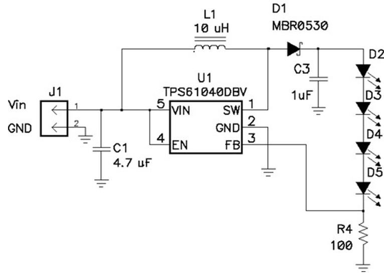 當輸出電壓總是比輸入電壓大時,最好采用升壓轉換電路,如圖6所示。該電路的U1有一個帶有控制電子器件的高度集成的電源開關。當開關閉合時,電流流過電感器到接地。當開關斷開時,U1的引腳 1 電壓會升高,直到D1導通。然后電感器放電,電流進入輸出電容器(C3)和LED串。在絕大多數應用中,C3通常用于平滑LED電流。如果沒有C3,則 LED電流將是斷斷續續的。也就是說,它會在零和電感電流之間切換,這會導致 LED 熱量增加(從而縮短使用壽命),亮度減少。在前面的例子中,LED 的電流是通過一個電阻感測的,并且占空比會發生相應的變化。請注意,本拓撲存在一個嚴重的問題,即它沒有短路保護電路。若輸出短路,則會有較大的電流通過電感器和二極管,從而導致電路失效,或者輸入電壓崩潰。