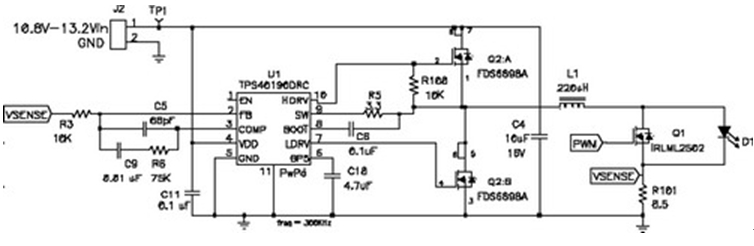 通常需要對 LED 進行調光。例如,需要調節顯示器或建筑照明的亮度。實現上述目標有兩種方法:降低 LED 的電流,或快速對 LED 進行開關操作。更有效率的方法是降低電流,因為光輸出并不完全與電流呈線性關系,并且,LED 的色譜在電流小于額定值時會發生變化。人們對亮度的感知是指數型的,因此,調光可能需要對電流進行很大更改,這會對電路設計造成很大的影響??紤]到電路的容差,滿電流值工作時,3%的調節誤差可以造成10%負載時的30%或更高的誤差。通過電流波形的脈寬調制 (PWM) 進行調光更為準確,盡管這種方法存在響應速度問題。在照明和顯示器應用上,PWM頻率高于 100Hz,以使肉眼感覺不到閃爍。10% 的脈沖寬度在ms量級內,并要求電源的帶寬大于 10kHz,此項工作可以通過圖8(A 與 C)中簡單的環路完成。圖9為帶 PWM 調光功能的降壓功率級電路。在本例中,LED 輕松地閉合/斷開電路。通過這種方式,控制環路總是處于激活狀態,并實現了極快的瞬態響應。