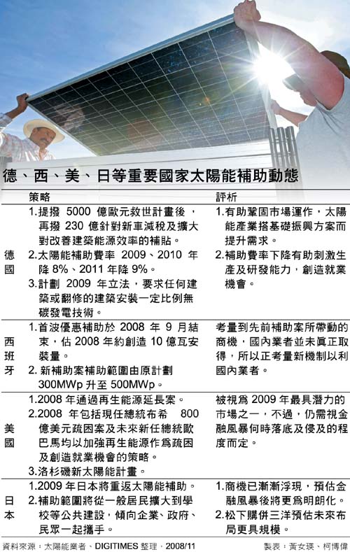 搭配各州政府自己擬定的太陽能補(bǔ)助政策及聯(lián)邦政府延長(zhǎng)的太陽能補(bǔ)助案,目前全美有許多州都在擬定這類的太陽光電補(bǔ)助計(jì)劃,其中又以加州最積極;似乎一切都就緒,就等待金融風(fēng)暴落底。