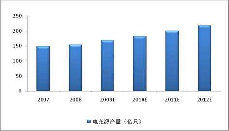 中國電光源(燈泡)行業能夠持續快速穩定的發展,其中很重要的原因是產品面向國際和中國兩大市場。在中國和國外消費市場推動下,2008年中國電光源產量達154億只,較2007年同比增長3.5%。隨著中國電光源質量和技術標準的提升,預計未來中國電光源產量增長率將為維持9%-12%之間。