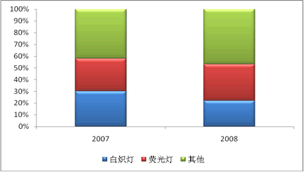 中國電光源的細分市場有白熾燈、熒光燈、特種燈泡等。其中2008年中國白熾燈的產量是34億只,較2007年同期減少23%;熒光燈產量為48億只,較2007年增長14%。2007年以來國家環保政策力度加大,不斷推廣節約用電。預計未來中國熒光燈產量持續保持上升,電光源產品結構趨于優化。