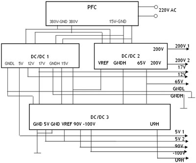 電源作為PDP的重要組成部分,要求效率高、體積小、能夠提供較大的瞬態(tài)輸出功率,并且具有保護(hù)功能和不同輸出電壓按順序啟動(dòng)的功能。