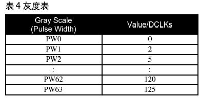 全彩顯示對每一個RGB原色分量提供6-bit,即64級灰度,通過電流驅(qū)動階段列驅(qū)動的脈寬調(diào)制(PWM)設置不同的灰度級。灰度表即為存儲了對應64級灰度(GS0~GS63)的PWM(PW0~PW63)的值。脈寬越寬,象素顯示越亮。因此,每個象素的顯示亮度由灰度表中的脈寬值決定。