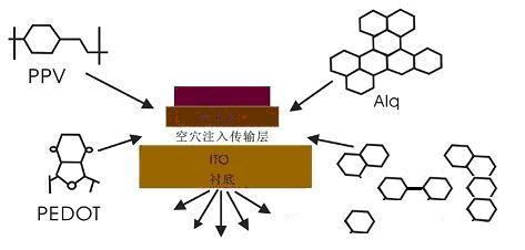 OLED的發(fā)光機(jī)理和過程是從陰、陽兩極分別注入電子和空穴,被注入的電子和空穴在有機(jī)層內(nèi)傳輸,并在發(fā)光層內(nèi)復(fù)合,從而激發(fā)發(fā)光層分子產(chǎn)生單態(tài)激子,單態(tài)激子輻射衰減而發(fā)光。[page]