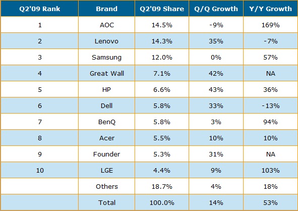 中國國內桌上型電腦市場現階段消費者喜歡自行組裝電腦(有時我們稱作DIY),桌上型液晶顯示器是其中一項只要的配件,這項特性也為白牌顯示器廠商提供了絕佳機會。從品牌廠商來看,2009年第二季度 AOC(冠捷)在中國成為第一大桌上型液晶顯示器品牌廠商,擊敗國內PC品牌的領導者Lenovo(聯想),這也進一步顯示出中國DIY市場強勁成長。AOC(冠捷)是TPV旗下的主要品牌,而TPV是桌上型液晶顯示器的最大代工廠商,不僅為自己品牌代工,也為全球最大PC與桌上型液晶顯示器品牌廠商如HP, Acer, Lenovo, Dell等代工。