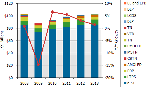 圖一 : 2008-2013全球平面顯示器按不同技術(shù)別出貨金額預估與年成長率(單位:百萬美金)