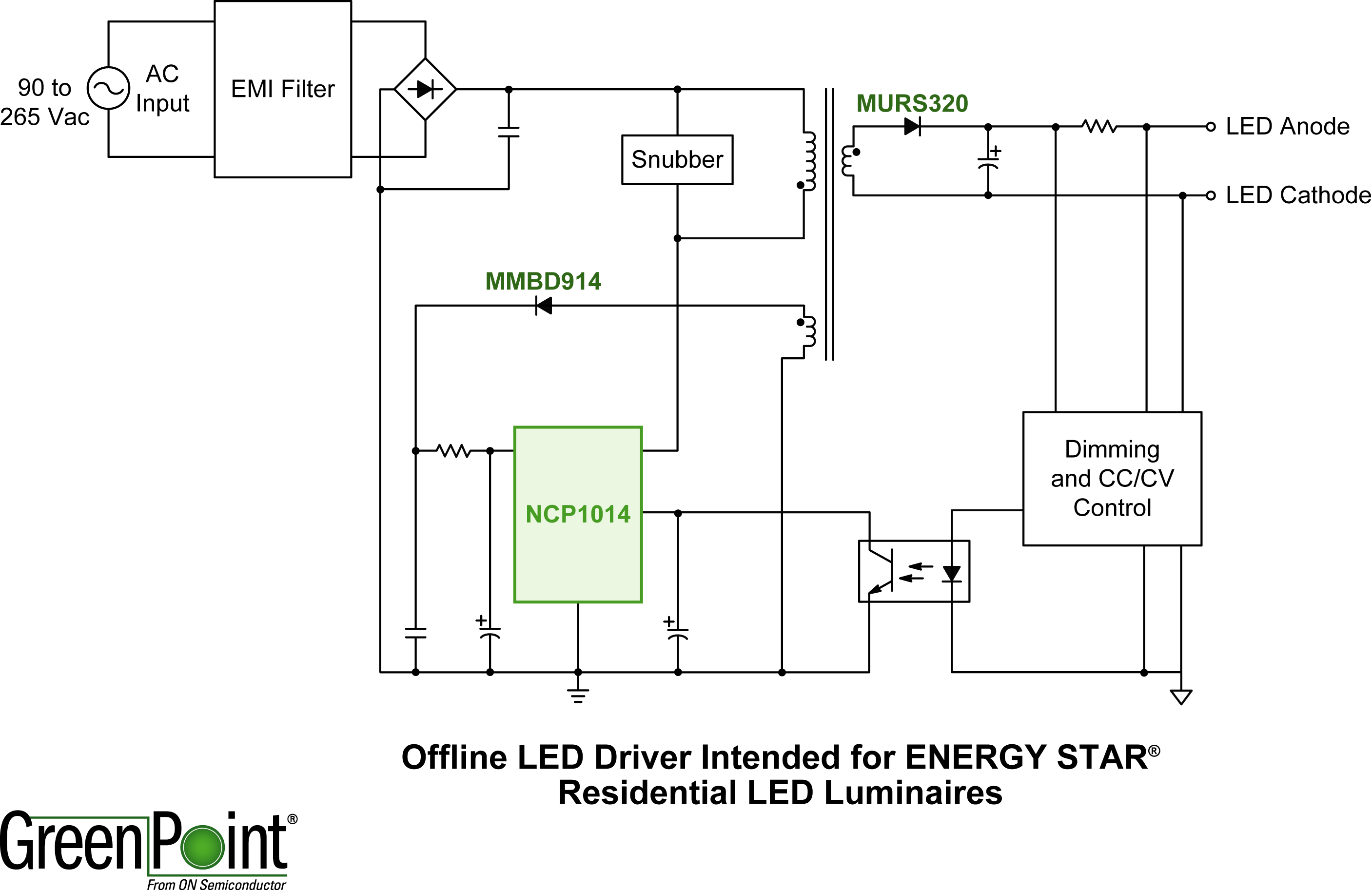 安森美半導體的另一款針對“能源之星”住宅LED照明的離線型LED驅動器GreenPoint®參考設計經過優化,驅動便攜臺燈、櫥柜內照明及戶外走廊燈等應用中的1到8顆大功率LED。這參考設計采用新穎的電路配置,無須增加額外的無源功率因數校正(PFC)網絡,即可在115 Vac條件下提供高于0.85的功率因數,減少了元器件數量,并輕松滿足住宅LED應用功率因數要求。這設計支持90 Vac至265 Vac的通用輸入電壓工作,采用安森美半導體集成了固定頻率電流模式控制器和700 V MOSFET的NCP1014開關穩壓器集成電路(IC)。