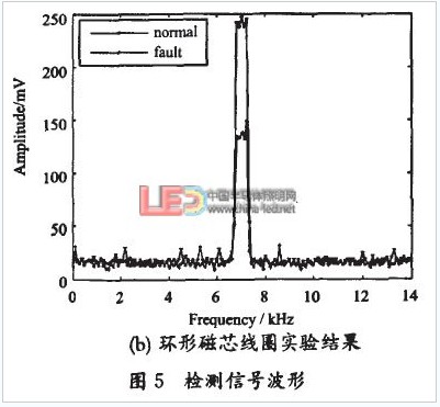 為了比較條形磁芯線圈與環(huán)形磁芯線圈對(duì)封裝缺陷檢測精度的影響,現(xiàn)分別使用條形磁芯線圈和圖3(a)示環(huán)形磁芯線圈進(jìn)行實(shí)驗(yàn)。磁芯材料為PC40,其初始相對(duì)磁導(dǎo)率約為2300,條形磁芯的外形幾何尺寸為1.6minx3.2ram×20mm,線圈匝數(shù)為300匝;環(huán)形磁芯橫截面尺寸為1.6mm×3.2mm,其有效磁路長度約等于條形磁芯,線圈匝數(shù)為300匝。實(shí)驗(yàn)中激勵(lì)光源為一種超高亮度貼片式白光LED,激勵(lì)光源用占空比為50%的方波信號(hào)驅(qū)動(dòng),方波信號(hào)可由一系列正弦變化的信號(hào)疊加而成,使其基頻與諧振回路的工作頻率相同,即LC諧振回路實(shí)現(xiàn)了對(duì)方波信號(hào)的選頻,所以穿過線圈磁通鏈的變化率就是方波基頻信號(hào)的變化率;檢測對(duì)象分別是GaP材料12mil黃色焊接質(zhì)量合格的LED和焊接過程中芯片電極有非金屬膜的LED。從線圈兩端輸出的信號(hào)經(jīng)放大、濾波、峰值檢波后見圖5。實(shí)驗(yàn)中放大器的放大倍數(shù)為103倍。