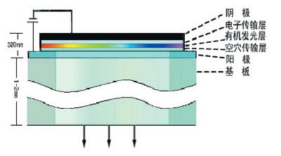 OLED是指有機半導體材料和有機發(fā)光材料在電場的驅動下,通過載流子注入和復合導致發(fā)光的技術。其原理是用ITO玻璃透明電極和金屬電極分別作為器件的陽極和陰極,在一定電壓驅動下,電子和空穴分別從陰極和陽極注入到電子傳輸層和空穴傳輸層,然后分別遷移到發(fā)光層,相遇后形成激子使發(fā)光分子激發(fā),后者經(jīng)過輻射后發(fā)出可見光。輻射光可從ITO一側觀察到,金屬電極膜同時也起了反射層的作用。下圖是一個簡單的OLED器件結構示意圖。