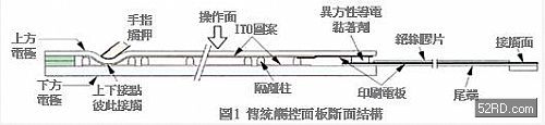圖1是傳統阻抗式觸控面板的斷面結構,如圖所示,阻抗式觸控面板是在玻璃板內側設置大小約5~10μm的隔離柱(spacer),隔離柱表面再黏貼厚度約200μm的PET膜片(sheet),玻璃板表面與PET膜片內側設有縱橫直交的透明阻抗電極格子ITO(IndiumTinOxide),正常狀態玻璃板表面與PET膜片兩者被隔離柱隔離無法導通電氣。
