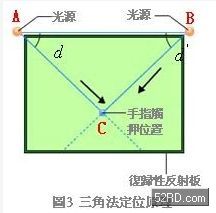大型觸控面板採「光線遮蔽方式」,圖3是光學式大型觸控面板應用三角法定位原理的動作原理,如圖所示,若知道A-B之間的距離、A點的夾角d,以及B點的夾角,就能夠確定C點的位置,A-B之間的距離為已知數,只要確定A點的夾角與B點的夾角即可。