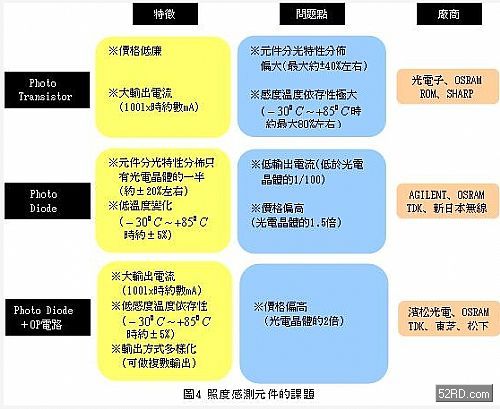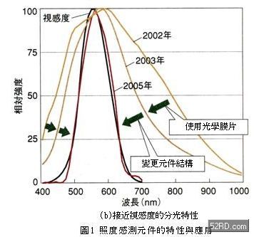 最近幾年照度感測元件(photosensordevice)技術上的進步,利用分光特性接近人眼視感度度的照度感測元件,可以有效解決上述問題。此外,根據統計資料顯示,全球照度感測元件潛在市場超過10億個,這包含6億支移動電話與接近近千萬臺的液晶電視,以及車用儀表、顯示器、照明燈具都是適用對象。期盼藉由本文的介紹,提醒業者降低液晶顯示器制作成本的同時,提高影像品質等產品區隔化技巧也是不可忽略的一環。