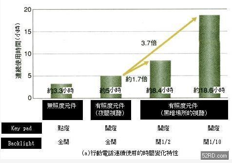 如圖2所示,照度感測元件具備感測夜間戶外只有(Lux;照度單位),乃至于晴天戶外亮度超過的特性,換句話說若能充分應用上述特性并作精密控制,理論上可以徹底解決各種電子設備因光源造成的影像不良等問題。例如照度感測元件可以隨時偵測周圍環境的光量多寡,自動調整背光模阻的點燈狀況,進而有效降低可攜式電子產品的電池消費電力(耗電量),同時延長通話與待機時間與電池的使用壽命(圖3(a))。