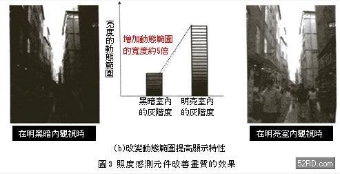 有關液晶電視的應用,主要是液晶顯示器的點燈時間越久消費電力就越大,相對的散熱處理與散熱風扇的噪音則變成非常棘手的問題,尤其是目前大型液晶電視的輝度大多超過時,在明亮室內畫面非常的亮麗,不過在黑暗室內卻會出現波紋現象,而且畫面太亮容易造成眼睛疲勞,黑暗色影像的黑色浮動現象非常明顯,影像對比則大幅降低。由于一般液晶電視是根據各畫素的液晶穿透率,調整背光模組的光線達成灰階化顯示目的,然而過多的背光模組光量卻有漏光之虞,如果利用照度感測元件偵測液晶電視視聽環境的亮度,依此調整背光模組的輝度,除了影像黑色浮動之外,灰階數相同的條件下還可以縮小亮度的動態范圍(dynamicrange),進而提高黑色影像表現能力(圖3(b)),并降低最大輝度解除影像太亮的困擾,這意味著觀賞液晶電視時,消費者不會受到視聽環境的影響,隨時可以獲得細膩的影像。