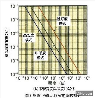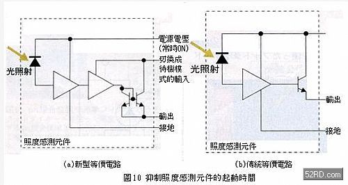 圖9是濱松光電(photonics)的新型照度感測元件,該元件可以將照度大小轉換成脈沖振盪頻率形式的輸出信號,該公司同時推出可以改變脈沖寬度,而且可以直接與微處理器連接的照度感測元件;OSRAM推出可以輸出對數顯示光電流,而且操作非常方便的照度感測元件,該元件計劃應用在汽車儀表等領域;東芝則開發起動時間縮短至1/5的新型照度感測元件。