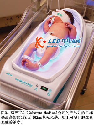 所幸,光療通常對此種病癥有效果,因為膽紅素會吸收藍光,分解為水溶形式而排出體外(圖2)。458nm~462nm區域中的窄帶藍光最有效。過去,膽紅素治療光線都采用定制的藍色熒光燈管和彩色過濾器。但是,熒光燈的光譜相對較寬。盡管其分布中心位于所需波長上,但光譜分布在兩端下降,表示能破壞膽紅素的光能量下降,因此治療時間將延長。與之相比,藍光LED膽紅素光源可以有正確的頻率,幾乎不浪費光能量。另外,LED的膽紅素光源有機械穩定特性,更長的壽命,也比熒光設備低廉。在未來,光線療法將能通過“發光服”提供光照,提供比光箱更有效的治療方法。