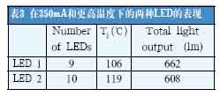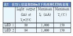 在數(shù)據(jù)表描述的25℃結(jié)溫和350mA的前向電流下,LED2的性能比LED1要好。但是,更實際的比較將在更高的結(jié)溫下進行(見表3)。