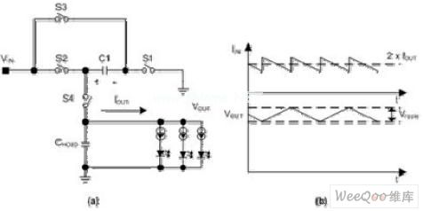 白光LED通常由一個恒定直流電流源驅動,以保持恒定的亮度。在采用單顆鋰離子電池供電的便攜式應用中,白光LED以及電流源上的電壓降之總和可以比電池電壓更高或更低,這意味著白光LED某些時候需要對電池電壓進行升壓。完成這樣應用的最好辦法是使用升壓DC-DC轉換器。這種方法可以大大地優化效率,但代價是成本和PCB面積增加。另外一種提升電池電壓的方法是使用電荷泵,也稱為開關電容轉換器。本文將詳細地分析這種器件的工作原理。
