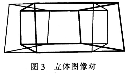 使用簡單的濾光鏡就可觀察有立體感的圖像。其原理是:由于濾光片(實驗中使用紅、綠濾光片)吸收其他光線,只讓相同顏色的光線通過,因此左、右眼各透過不同顏色的光。當使用濾光鏡觀察計算機屏幕上的立體圖像對時,就會看到具有深度感受的圖像。在實驗中發現,刷新頻率對圖像立體效果的形成具有重要作用。刷新頻率過低,由于人眼所維持的圖像已消失,不能得到三維立體感受;刷新頻率過高就會出現一只眼睛可看到兩幅圖像的現象。將顯示的刷新頻率設置合適,在程序中設置圖像刷新頻率設置為50Hz,利用紅綠濾光鏡觀察模型的立體成像,得到較明顯的立體視覺效果。