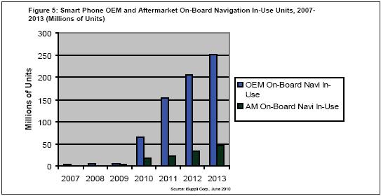 iSuppli公司預(yù)測,隨著智能手機在未來10年成為戰(zhàn)略性計算平臺,2010年基于智能手機的OEM和售后市場on-board導(dǎo)航系統(tǒng)使用量預(yù)計增長九倍,2014年有望增長到近40倍。