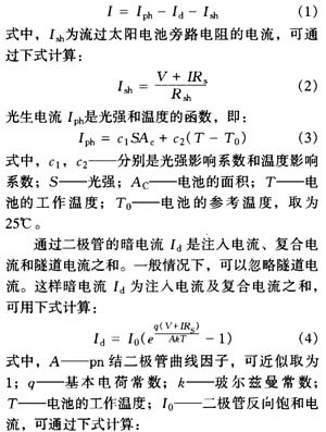 如果在太陽電池兩端接上一個負載電阻RI,那么太陽電池在工作狀態下的等效電路如圖l所示。它相當于一個電流為J9h的恒流源與一只正向二極管并聯。流過二極管的正向電流在太陽電池中稱為暗電流Id。Rsh稱為旁路電阻.主要由下列幾種因素引起:如表面沾污而產生的沿著電池邊緣的表面漏電流;沿著位錯微觀裂縫、晶粒間界和晶體缺陷等形成的細小橋路而產生的漏電流。Rs稱為串聯電阻,系由擴散頂區的表面電阻、電池的體電阻和上下電極與太陽電池之間的歐姆電阻及金屬導體的電阻構成的。