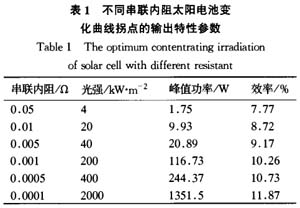 從圖2也可以看出,太陽電池的峰值功率隨光強的升高而首先直線上升,升高到一定程度后,曲線變得平緩。不同串聯內阻的太陽電池峰值功率變化曲線的拐點如表l所示。對于直徑為10cm的常規太陽電池,其串聯內阻一般在0.05—0.010之間。由表l可知,若采用聚光系統性能好(串聯內阻小)的常規太陽電池最多可以在20倍光強下工作,能得到較好的效果,若再增加光強,收效很小,反而增加了成本。對于一般常規太陽電池可能只能在幾倍光強下得到較好的收益。若想使太陽電池工作在更高的光強下,必須采取措施,降低電池的串聯內阻,這樣勢必會增加大陽電池的成本,而且串聯電阻越小,其成本會越高,因此并不是光強越高越好,而是存在一個成本最低的最佳光強。