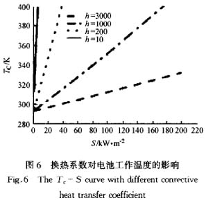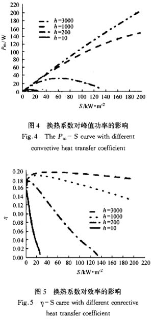 太陽光照射到太陽電池上,一部分轉變為電,而大部分卻轉變為熱,使太陽電池溫度升高,從而影響太陽電池的性能。在同樣條件下,不同的冷卻方式和工況,太陽電池的工作溫度也不同,也就是電池的性能也不同。而冷卻方式和工況的不同主要表現為換熱系數的不同。圖4—圖6給出了換熱系數對系統性能的影響規律。從圖中可以看出,換熱系數越高,系統的性能越好,而且隨著光強的升高,換熱系數的影響越來越顯著。